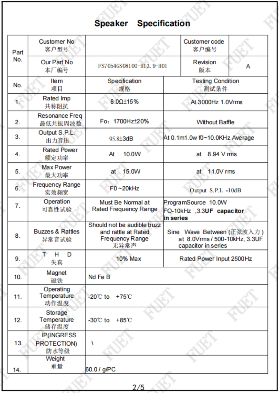 出力音壓 95.8±3dB At 0.1m1.0w f0~10.0KHz Average